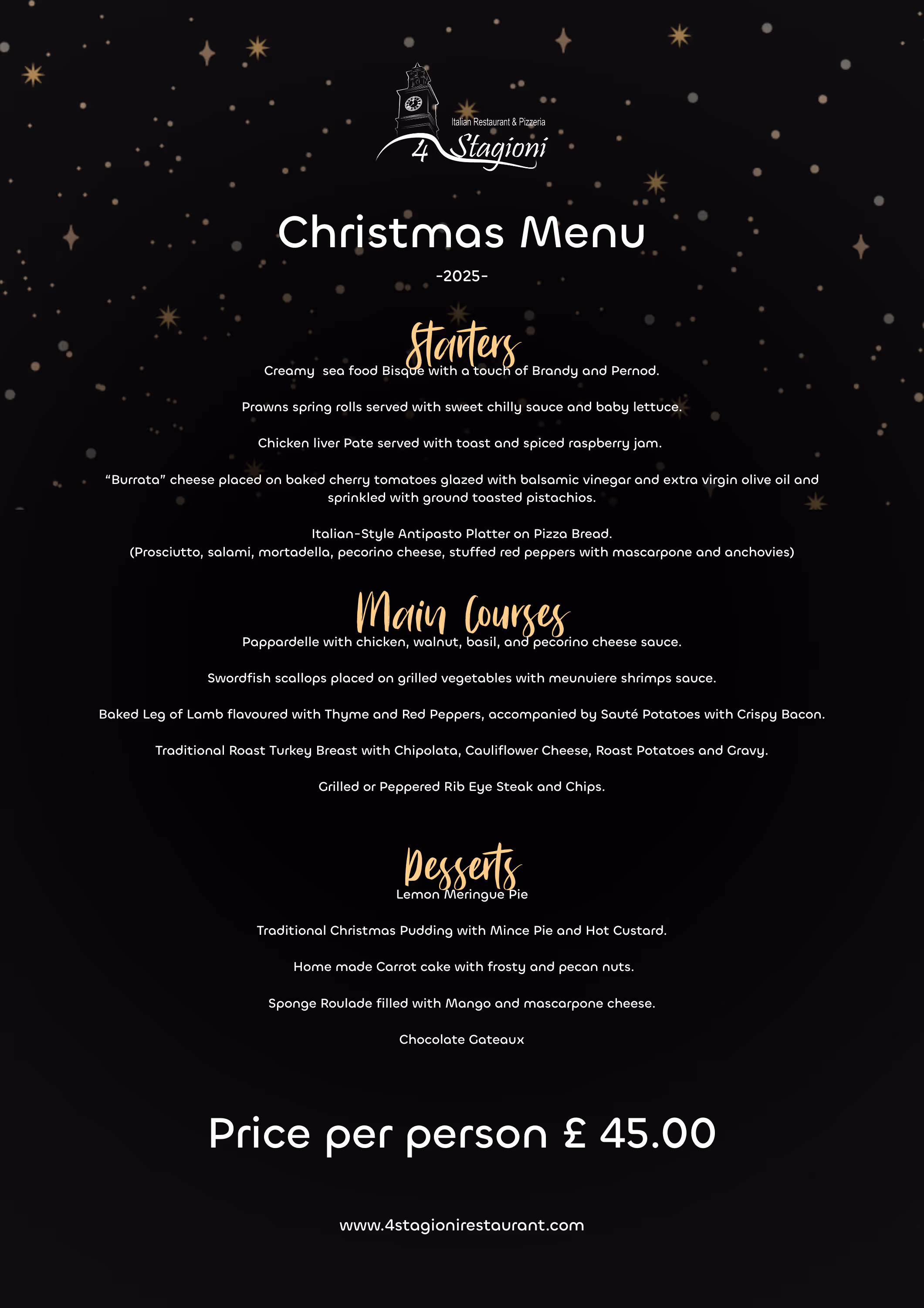 Celebra la magia de la Navidad en 4 Stagioni con un menú festivo lleno de auténticos sabores italianos y mediterráneos. Disfrute de una cálida velada rodeado de deliciosa comida y espíritu navideño, desde deliciosos entrantes y asados tradicionales hasta deliciosos postres caseros.